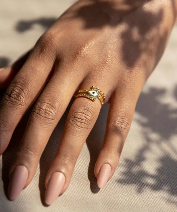 Ward off negativity with our Evil Eye and Diamonds Ring, a protective charm in 14Kt gold. The design features a mesmerizing evil eye motif adorned with diamonds, creating a captivating and symbolic piece. This ring seamlessly combines spiritual significance with elegant design, making it a unique and meaningful accessory.