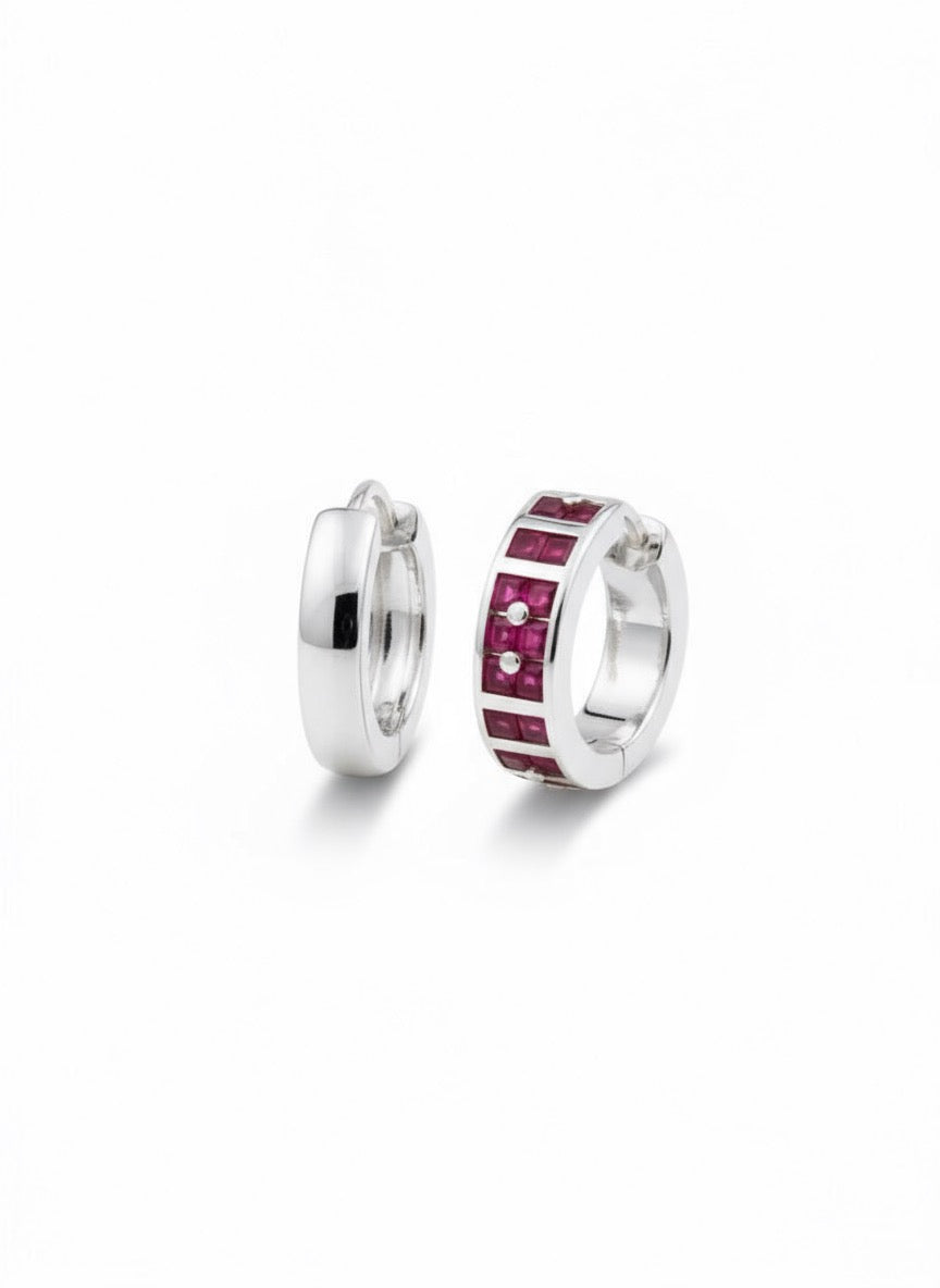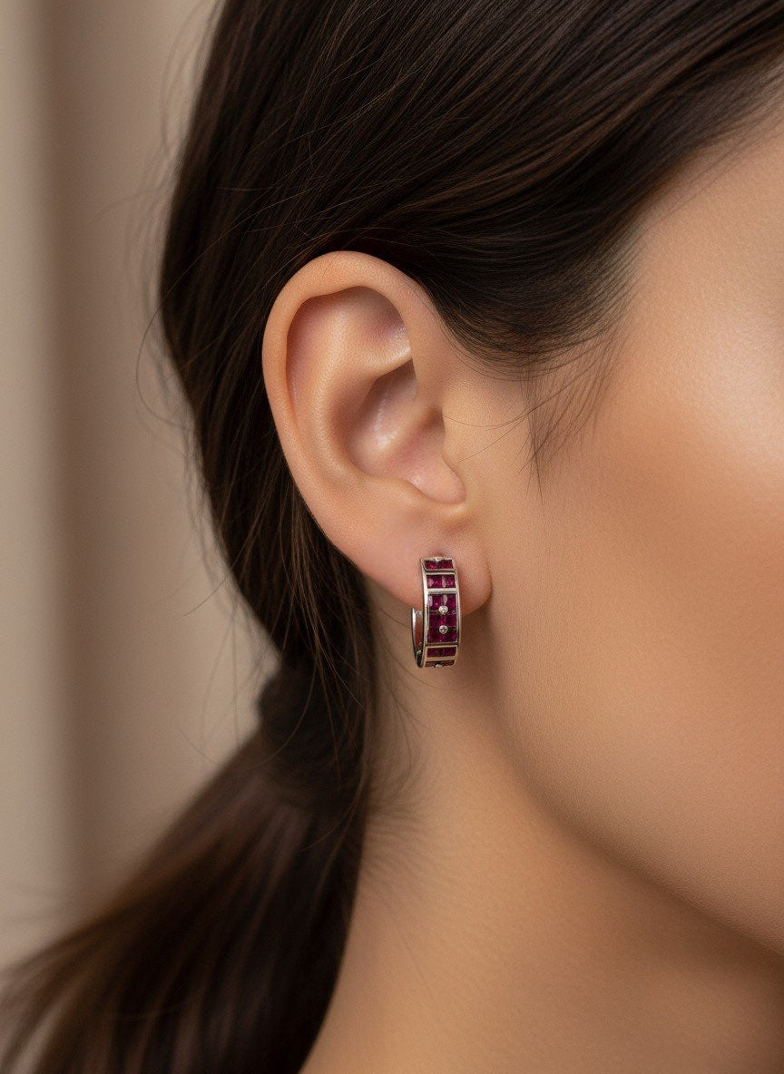 Intense color, perfected. These small hoop studs feature brilliant, fiery Rubies set closely together to maximize light and color saturation. A powerful, everyday burst of deep red luxury that "hugs" the earlobe.