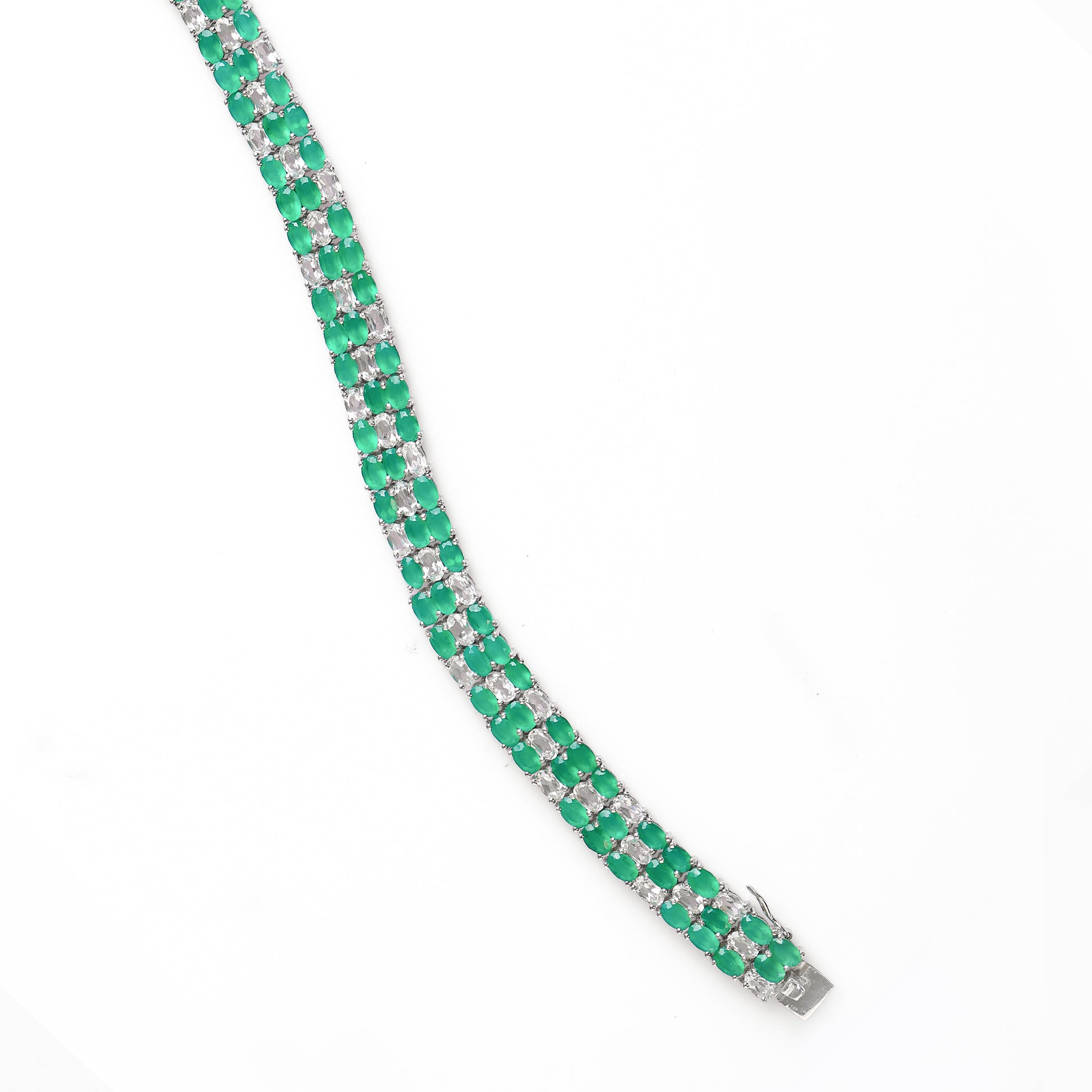 The Grace Wrap Bracelet — elegance that wraps around you. Crafted in 925 sterling silver, this striking tennis-style bracelet features lush green onyx and sparkling white topaz in a fluid, double-wrap silhouette. Designed to feel weighty and rich, it brings a refined statement to your everyday or evening wear, with just the right balance of vibrance and sophistication.