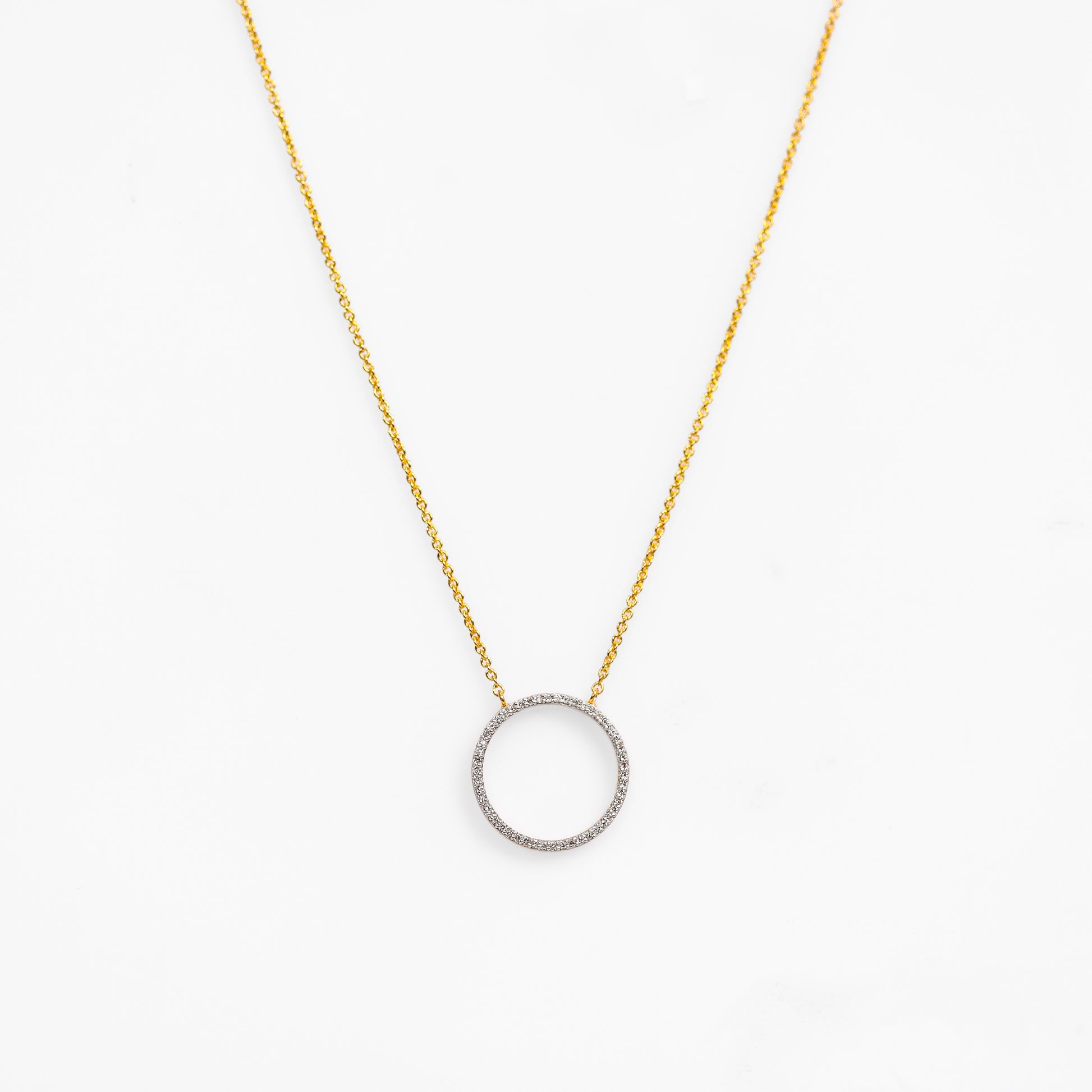 A perfect symbol of eternity and grace, this circle-shaped diamond necklace is crafted in glowing gold and encrusted with sparkling diamonds. The circle pendant, fully set in brilliant-cut diamonds, radiates sophistication and modern charm.