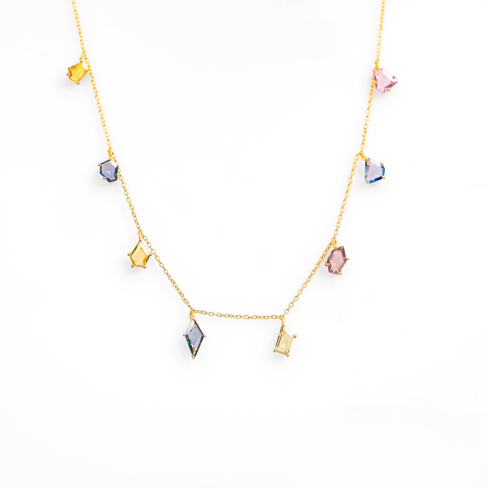 Celebrate the beauty of nature with this exquisite multi-sapphire necklace, featuring uncut sapphire drops in a spectrum of mesmerizing hues. Each raw sapphire retains its organic charm, making the piece uniquely one-of-a-kind. The drops cascade gracefully along the neckline, creating a natural yet luxurious look that radiates effortless elegance.