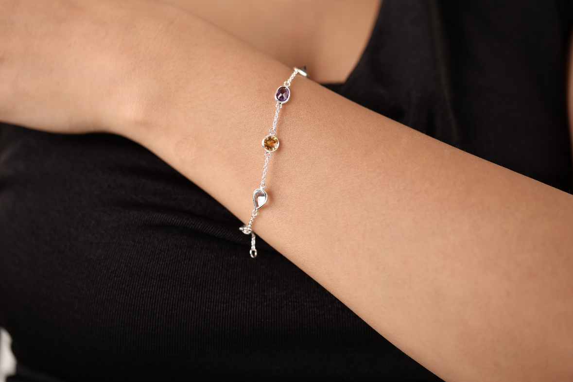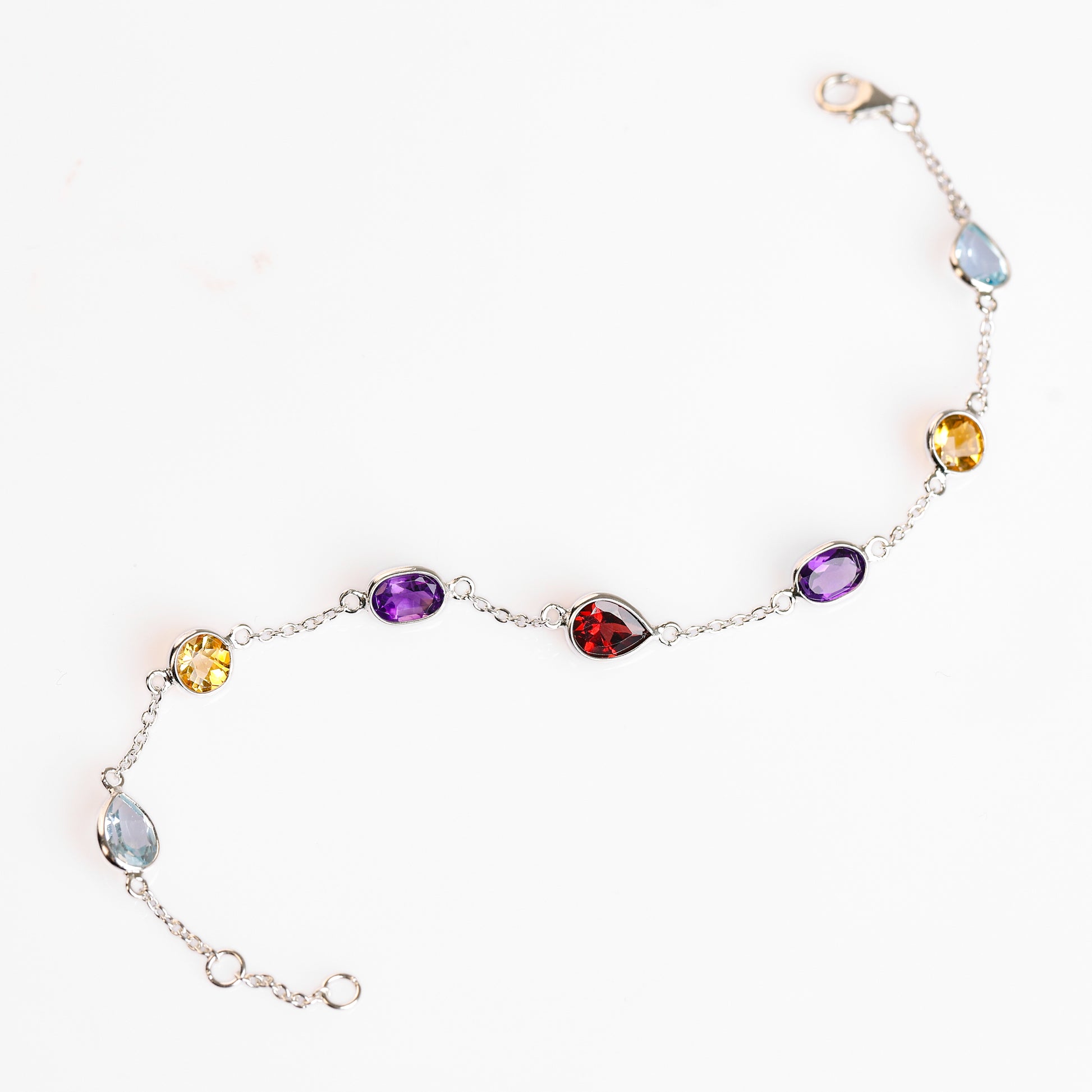 The Rainbow Drops – a celebration of color and spirit. Crafted in 925 sterling silver, these chain earrings feature a cascading dance of natural gemstones in vibrant hues — amethyst, citrine, peridot, blue topaz, and more. Light, playful, and expressive, they bring joyful movement and bold elegance to every look.